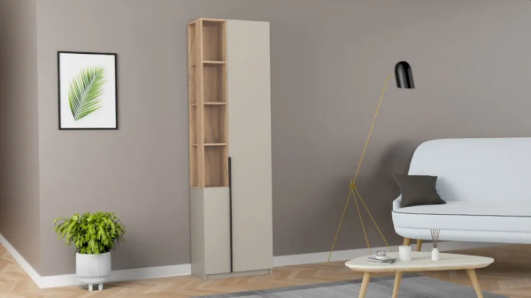 Шкаф-пенал имеет 4 открытых полки, на которых можно разместить декор, цветы, игрушки. Также стеллаж оборудован 2 распашными дверцами: за маленькой находится 2 полки для хранения во всю длину, за большой кроме этих 2 полок еще 4 полки для хранения.
