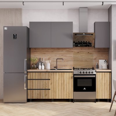 Универсальный дизайн кухни "Шерлок" легко адаптируется под различные интерьерные решения. Фотопечать "рейки" создает иллюзию фактурности. Высокие ножки позволяют без труда поддерживать чистоту на кухне с помощью робота-пылесоса.