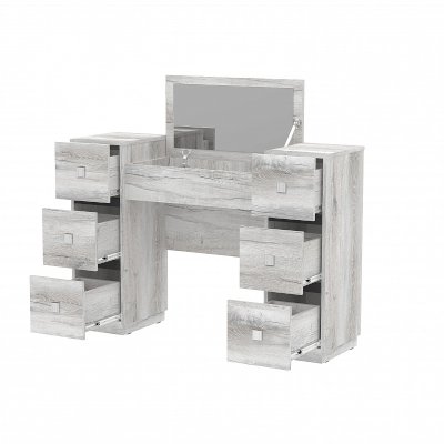Туалетный столик просто необходим красивой женщине, которая привыкла обстоятельно ухаживать за собой. Стильный и функциональный он не займет много места в спальне. Разместите его в у окна, чтобы приводить себя в порядок при естественном освещении. Откидная крышка стола с зеркалом скрывает нишу с делителем для хранения аксессуаров, а в 6-ти выдвижных ящиках, глубиной 30 см, высотой 15 см и шириной 20 см, найдется место для множества баночек и флакончиков. Кроме того, ящики оснащены шариковыми направляющими, что обеспечивает их плавных ход и минимальный люфт.