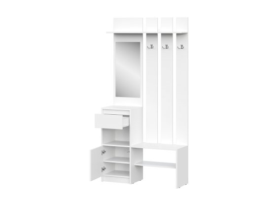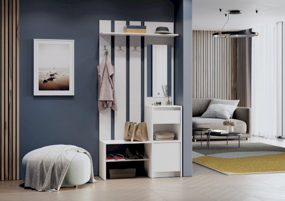 Вешалка выполнена полностью без ручек, ящик открывается с помощью захвата рукой, на распашном фасаде установлена система открывания PUSH-TO-Open.